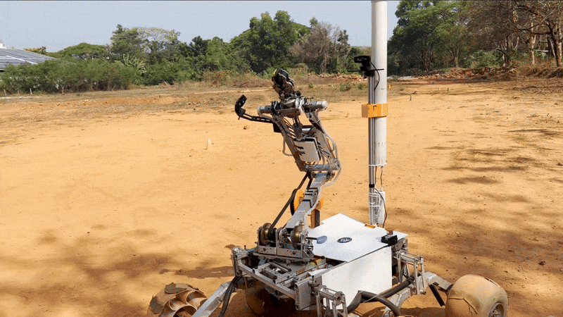 The rover is engineered with optimised wheels, suspension, and chassis for off-road terrain, and features a ruggedised 6-DOF manipulator alongside an automated soil collection and chemical analysis module. The rover is controlled via STM32 CAN-based microcontrollers. Manipulator positioning uses inverse kinematics with PID control, while stereo cameras, LiDAR, GPS, and IMU enable visual odometry, obstacle avoidance, and waypoint navigation.