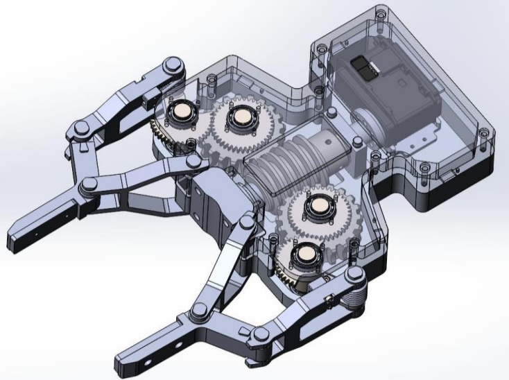 Designed an underactuated gripper with adaptive parallel and encompassing grip modes.